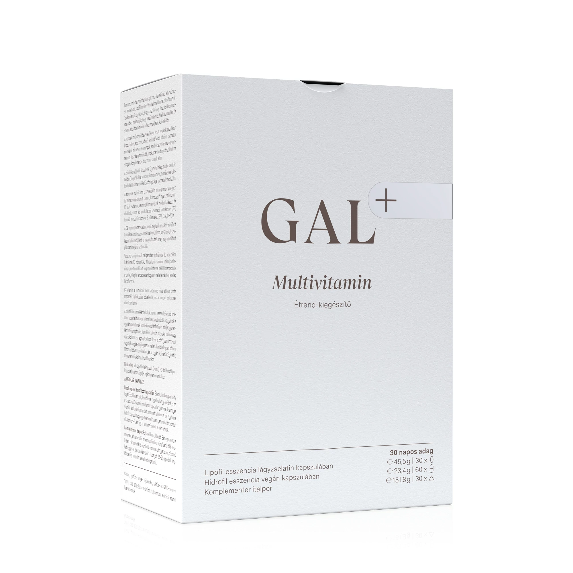 A GAL+ Multivitamin termékünket a legújabb kutatások fényében fejlesztettük ki, szem előtt tartva a természetességet és életszerűséget, hogy minden vitamint, ásványianyagot, nyomelemet ideális formában, mennyiségben és arányban tartalmazzon, nem eltérve attól, ahogyan ezekhez állandó tápanyagdús, változatos táplálkozással juthatnánk. Ahol előnyös, a vitaminok és ásványok részben organikus termesztésből származó (bio) gyógy- és fűszernövények kivonatából származnak. A mennyiségek esetében végig fontosnak tartottuk, hogy a napi adag biztosan tartalmazza a hatásosnak talált dózist, de semmi esetre se lépje túl az életszerű mennyiségeket, azaz azt a mennyiséget, amit táplálkozással már nem is lehetne fedezni sehogyan sem. Emellett rendkívül fontos, hogy a gondosan válogatott alapanyagok mellett ne lábatlankodjék semmi, ami nem odavaló. A termékünkben ilyesminek nyomát sem találja.